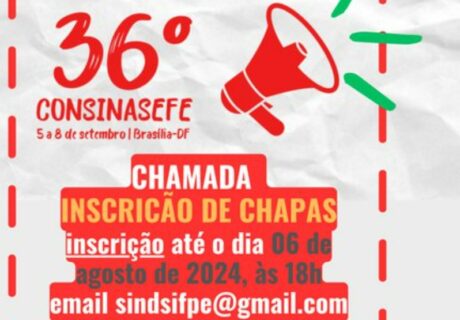 INSCRIÇÃO DE CHAPAS AQUI BAIXE – DONWLOAD PDF A Diretoria Executiva do SINDSIFPE, Gestão “Unidade e resistência democrática”! (Biênio 2024-2026), vem,…